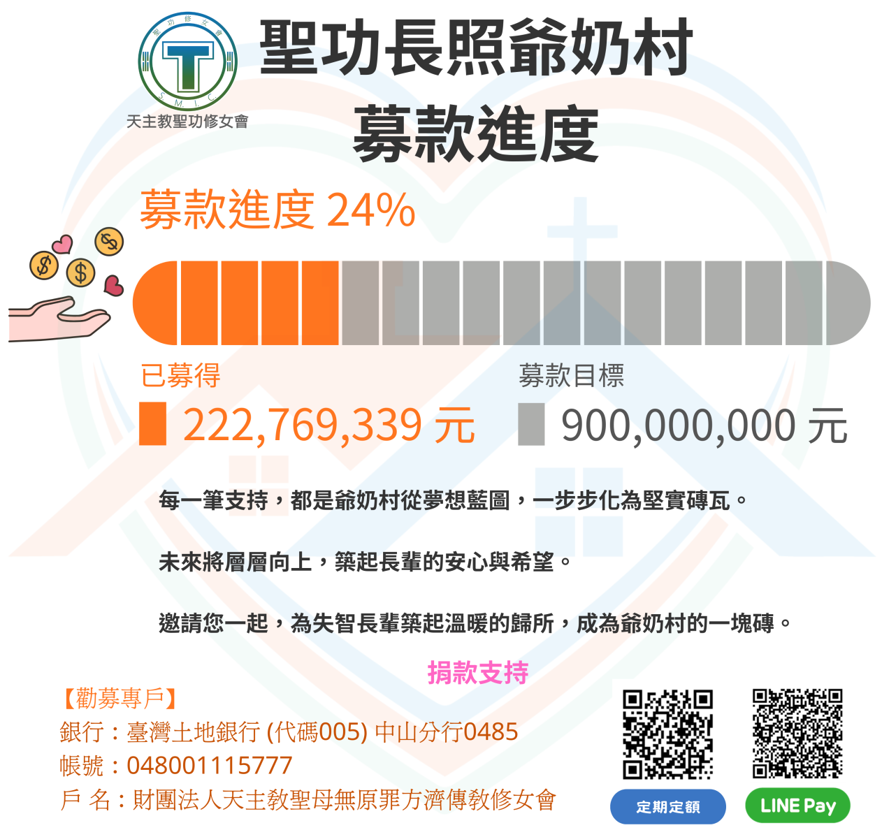 雨淋不熄希望不滅,愛的進行式需要你接力。 爺奶村施工中,每延一天成本就增加,工程停擺心也揪緊。誠摯邀您一起籌建「聖功長照爺奶村」,為失智失能長輩築起安心的家。