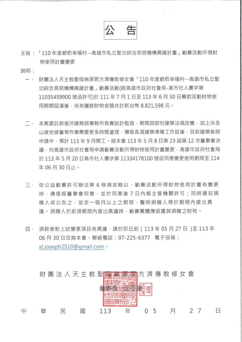 - 捐款者對上述變更項目有異議,請於即日起(113年05月27日 )至113年06月30日洽詢本會。聯絡電話:07-225-6377 電子信箱: st.joseph2510@gmail.com。