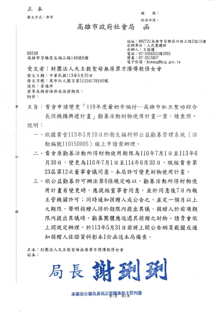 主旨 : 「110年度爺奶幸福村--高雄市私立聖功綜合長照機構興建計畫」勸募活動所得財物使用計畫變更